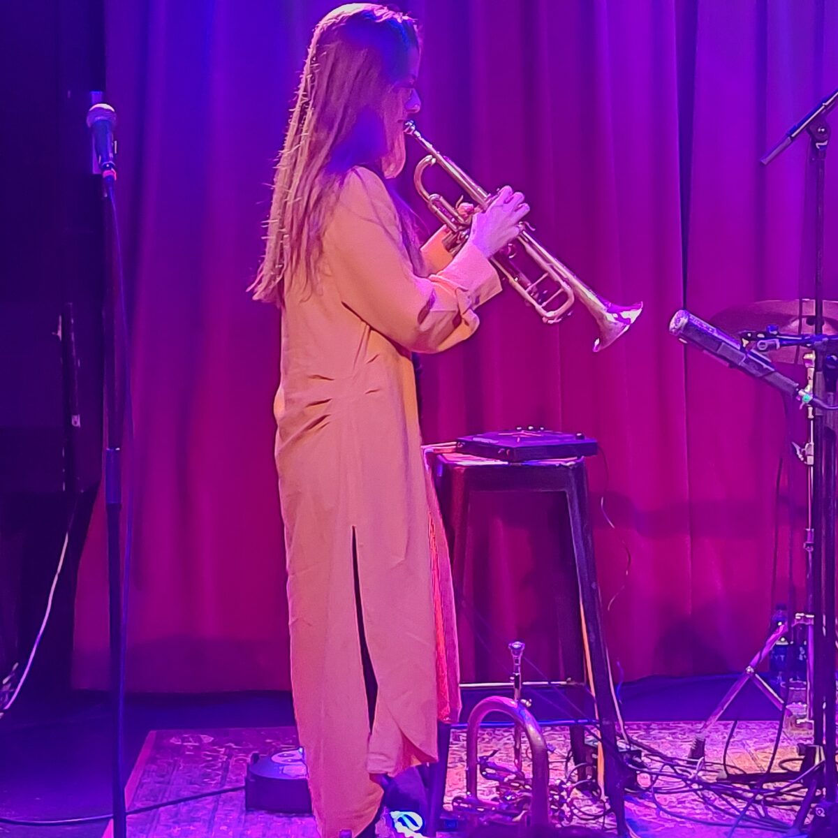 Vi sveps direkt in i ett österländskt, mytiskt och mystiskt stämningsläge då Yazz Ahmed inleder med She stands on the shore. Ett stycke som dels är öppningsspåret på hennes uppmärksammade skiva A paradise in the hold som släpptes i våras, dels en positionsbestämning och utgångspunkt i utforskandet av hennes bahreinska rötter och arv. Ett långsiktigt och omsorgsfullt arbete som varit en röd tråd i hennes musikaliska gärning sen debuten för 15 år sedan. Merparten av konserten utgick ifrån A paradise… vars kompositioner är både storskaliga och innehållsrika i arrangemang och utförande. Därför var det ytterst intressant att se hur Ahmed – i en nedskalad sättning – skulle kunna både skapa och återskapa de komplexa förutsättningarna. Och det är bara att konstatera att hon och hennes tre medmusiker lyckades mer än väl. Det mindre formatet ger en renodling som lyfter och belyser fram detaljer i mångfalden. Sättningen med vibrafon, elbas och trummor ger en lätthet och rörlighet och i kombination med elektronisk förstärkning, samplingar och förinspelat vokalmaterial genereras både en bred och djup ljudpalette. Allt är mycket nogsamt arrangerat och noterat. Det fanns lite utrymme för improvisation, förutom i de avvägda solistiska utvikningar som förekom sparsamt. Vibrafonisten Ralph Wyld har spelat länge med Ahmed och läser av hennes subtila styrningar momentant, men gavs även eget utrymme bl.a med ett expressivt solo i Al Naddada.